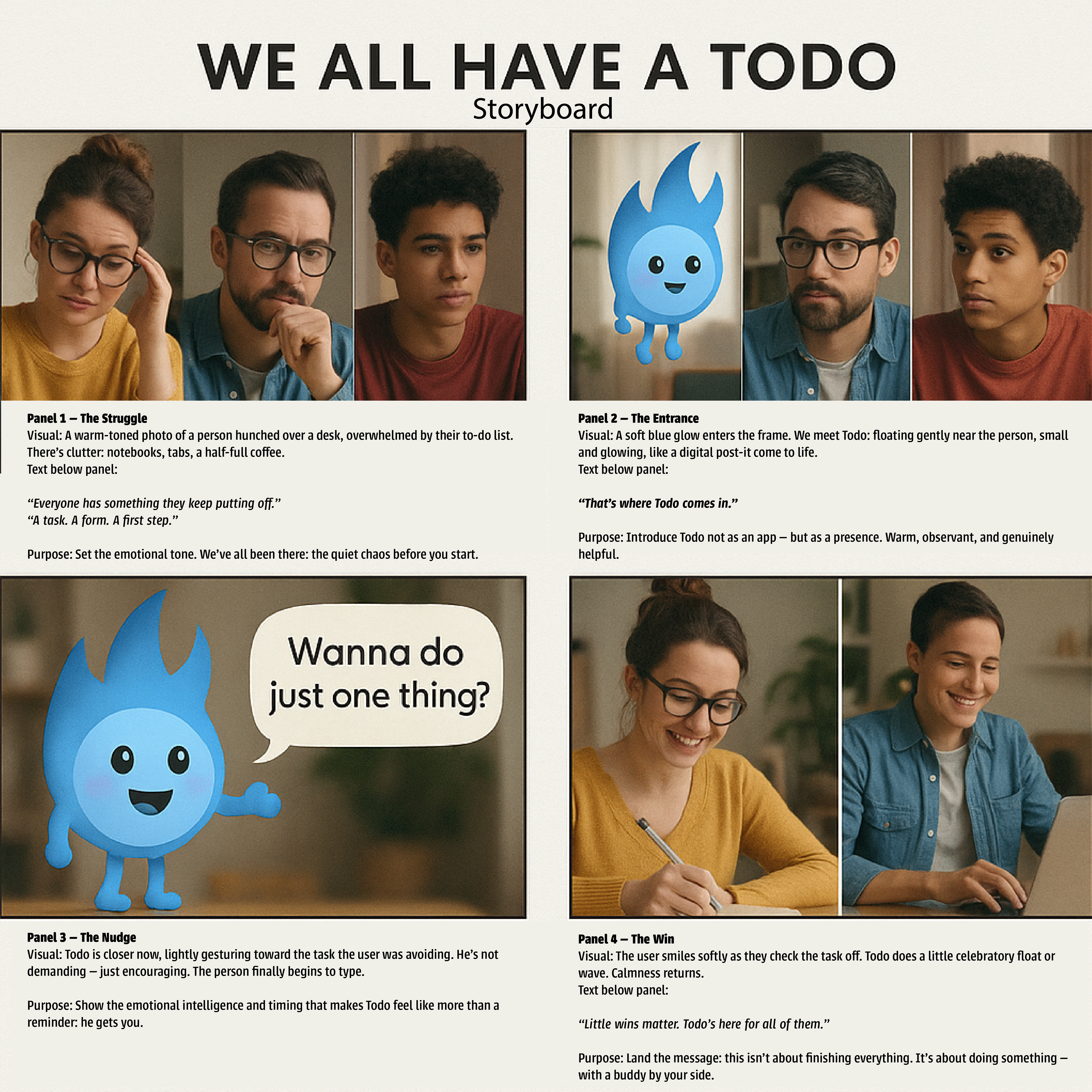 To bring To‑Do Buddy to life emotionally, I developed a campaign video concept designed to resonate with students, creatives, and everyday procrastinators.